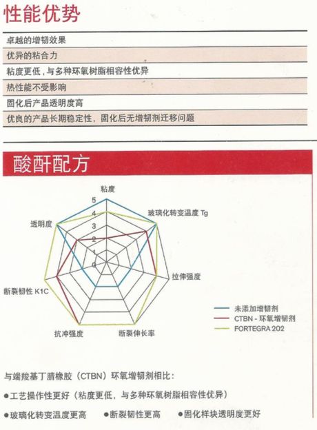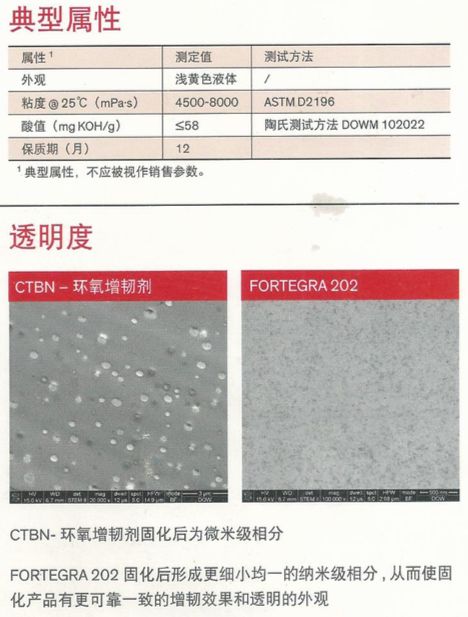 F202是溢科化工推出的一款特殊增韧剂,可用于环氧与不同固化剂,如酸酐,胺,酚醛等的固化体系,在固化后,通过在固化体系中形成纳米级的均匀相分,能使固化产品有更强,更一致的可靠韧性,并且保持更高的透明性和更强的粘结力,同时对体系的粘度和玻璃化转变温度基本上不影响。能达到陶氏化学F202同样性能。