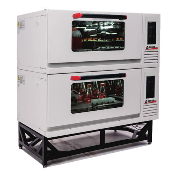 本恒温振荡器使用三轴偏心平衡机芯,稳定可靠,使用 寿命长。转速控制系统带有速度终端反馈系统,使机器保持 高精度振荡。PID控制技术与模糊控制技术的结合与创新, 实现了温度范围内的高精度控制。应用变频压缩机制冷,效 率高,能耗小,制冷更精确,控制更稳定。可12段编程运行, 实现同一种样品在不同环境条件下和不同运行时间来自动创 造所需求的环境。可选配先进的Wifi监控系统,可多台手机同 时远程无线监控同一机器,及时获取无进气等报警信息以快速 处理紧急情况,安全保护培养细胞等。适合大试和中试。 参数 | 产品型号 | IS-5 | IS-5C | IS-5C5 | | 产品名称 | 叠加式恒温振荡器 | | 主要区别特征 | 450L(可放常规5L瓶),全温, 触屏 | 450L(可放常规5L瓶),全温,带CO2 ,触屏 | 450L(可放常规5L瓶),全温,带CO2,触屏, 50振幅 | | 摇板尺寸 | 900x560mm | | 最大烧瓶夹/粘贴垫数量 | 烧瓶夹:50mlx135 / 100mlx60 / 150mlx60 / 200mlx60 / 250mlx60 / 500mlx38 / 1000mlx24 / 2000mlx15 / 5000mlx6 粘贴垫:50mlx187 / 100mlx112 / 150mlx104 / 200mlx84 / 250mlx77 / 500mlx40 / 1000mlx28 / 2000mlx15 / 5000mlx8 | | 容量 | 450L | | 最大负载 | 20kg | | 温控范围 | 室温以下 18℃~60℃ (最低4℃) | | 温控精度 | 0.1℃ | | 温度均匀性 | ±0.5℃ (@37℃) | | 旋转转速 | 0 (停止), 30~300rpm | | 转速精度 | 1rpm | | 振幅 | Φ26mm | Φ50mm | | CO2传感器 | 无 | IR (红外线) | | CO2浓度控制范围 | 无 | 0~20% | | CO2浓度控制精度 | 无 | 0.1% | | 开门30s重启后温度恢复时间 | ≤6min (@37℃) | | 开门30s重启后CO2浓度恢复时间 | 无 | ≤6min (@5%) | | 湿度类型 | 无 | 自然增湿 | | 最大湿度 | 无 | 95% | | 可编程段数 | 12段 | | 照明 | 双向照明 | | 灭菌 | 紫外杀菌 | | 开门方式 | 下开 | | 设置参数保护 | 密码保护 | | 温度和光照循环 | 有 | | 曲线显示类型 | 温度曲线、速度曲线 | 温度曲线、速度曲线、CO2浓度曲线、湿度曲线 | | 显示方式 | 电容式, 10寸彩色触控屏 | | 定时范围 | 0~999小时 59分钟 | | U盘导出数据 | 有 | | 屏上可查运行参数天数 | 7天内 | | 运行数据贮存周期 | 多于912天 | | 运行数据贮存时间间隔 | 1分钟 | | 数据贮存内容 | 运行时间、温度参数、速度参数、机器状态 | 运行时间、温度参数、CO2浓度参数、湿度参数、速度参数、机器状态 | | 自动除霜 | 有 | | 自动关闭屏显 | 有 | | 自动锁屏 | 有 | | **层摇板高 | 1256mm | | 摇板带导轨 | 有 | | 噪音等级 | ≤55dB | | 可水冲洗 | 是 | | 界面语言 | 可切换中文、英文显示 | | 来电自动恢复功能 | 是 | | 加热功率 | ≤850W | | 制冷功率 | 70~180W(变频制冷) | | 功率 | ≤950W | ≤1000W | | 电源 | AC 220V±22V,50Hz / 60Hz | | 自动补水(选配) | 选配 | | WiFi手机监控(选配) | 选配 | | 电脑监控(选配) | 选配 | | 遮光板(选配) | 选配 | | 净重 | 325kg | 330kg | | 内腔工作高度 | 430mm | | 外形尺寸 | 1400x886x (700+80地脚高)mm |