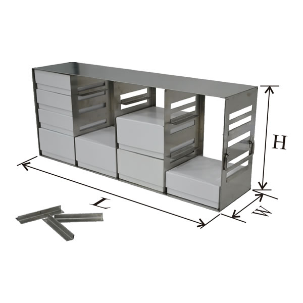 立式低温分隔架可存放纸盒、塑料盒和各种金属盒,由高品质的耐腐蚀不锈钢材料制成,设有手柄和识别卡插槽。该产品使实验样品的存取和管理更为有序,带抽屉的分隔架在推拉抽屉的同时,即可轻松存取实验样品,无须从冰箱中搬移整个分隔架。每个分隔架均有适合的安全锁定装置匹配。按照上图的示意,测量出您所使用冰箱的内部尺寸,通过这些尺寸,即可确定适合您立式冰箱的分隔架的高度(H)、长度(L)和宽度(W)。 参数