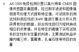 ² 内置嵌入式工业电脑,基于Windows 7操作系统,实现友好人机互动界面。 ² 10.4英寸彩色触摸液晶显示屏,带VGA/HDMI输出接口,可独立双显。 ² 使用高分辨率工业级CMOS图像传感器采集图像,工作可靠性好,分辨精度高。 ² 采用QR Code标准二维码,实现检测系统自动化管理。 ² 仪器外观设计运用人机工学原理,轻巧灵活,操作简便,输出结果快速、准确。 ² 软件界面语言支持中/英文切换选择,并可扩展。 ² 核心处理器采用英特尔双核处理器,标配32GB硬盘。 ² 内置微型打印机,检测结果即时打印输出,方便快捷。 ² 标配 USB接口、RS232接口和网络接口。 ² 内置智能加热系统,可对有需要的检测物进行均匀加热,控温准确、稳定性好。 ² 可通过标准电源或可充电电池供电,两种供电模式,灵活实用。 测试项目:瘦肉精三项、氯霉素、孔雀石绿 超大全触摸彩色液晶屏+可外接键盘鼠标