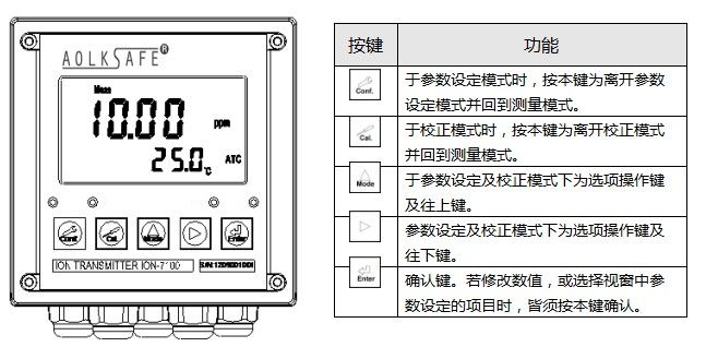 ² 144*144微电脑设计离子浓度控制器 ² 户外防水型设计,适合墙装、盘装、圆管安装 ² 提供电极自动清洗装置接点,程序设定输出 ² 大型液晶显示屏,附带操作状态及特殊符号显示 ² 具背光感应器,自动及手动背光设定功能 ² 自动校正,手动/自动温度补偿功能 ² 密码锁及组合键进入设定、校正模式设计,增加安全防护 ² 具RS-485标准MODBUS通讯协议,可直接与数位系统连接(ISE-8210RS serial only) ² 两组可编程输出(ISE-8210 serial only) 面板及按键说明