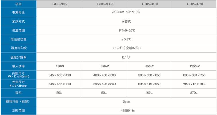 1、用途概述 适用于医疗卫生、医药工业、生物化学和农业科学等科研或生产部门,作细胞培养、发酵等恒温实验使用。 2、产品特点 大屏幕液晶显示,多组数据一屏显示,菜单式操作界面,简单易懂,便于操作。(标配) 采用自主设计的压力平衡进气口,避免了因加水过快而引起的倒抽现象 双层门结构,隔热性能好,观察箱内情况时不影响箱内温度。 隔水式加热方式,温度均匀,且断电后仍能保持较长时间恒温。 采用镜面不锈钢内胆,四角半圆弧设计易清洁,箱内搁板间距可调。 箱体外壳采用优质冷轧钢板制造,表面静电喷塑 PID控制方式,箱内温度超过设定值或水夹套水位过高过低,即自动发出声光报警。低水位停止加热 独立限温报警系统,超过限制温度即自动中断,保证实验安全运行不发生意外。(选配) 具有RS485接口或USB接口,可连接计算机或打印机,能记录温度参数的变化状况。(选配) 3、可选配件 智能型程序液晶控制器 独立限温报警系统 嵌入式打印机 RS485接口和专用软件 4、技术参数