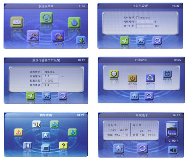 性能特点 n7英寸超大彩色触摸屏,动画式菜单控制系统; n进水、RO水、UP水三路水质及温度显示,**实现在线监控; n耗材失效自动提醒,避免水质下降; n系统设置密码保护功能,防止未经授权更改数据; n定期自动循环,此刻保护稳定水质; n可自由启动,关闭循环系统; n兼容压力水桶和液位水箱2种纯水储存方式,可直接显示水位和储水量; n定量取水功能(1-999999ml); n定质取水功能(0.1-18.25MΩ.cm); n完善的信息查询及数据管理功能,全面掌握系统运行状态、水质、耗材使用、历史报警等信息; n标配USB接口,可连接打印机,打印历史水质、取水量等情况; n标配一键消毒功能组件,实现RO膜、循环管路、水箱快速消毒,保证系统极低的细菌污染水平; n系统时间设定(年/月/日/时/分)、定时待机(0~60min)、定时关机(0~24h)功能; n可任意设定预处理、RO膜、UV灯和超纯水包寿命,显示耗材使用和剩余时间; n内置RO膜防垢定时自动冲洗功能,延长RO膜使用寿命; n全塑外壳,永不生锈;