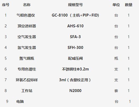 详细信息 n采用320 x 240点阵5.7英寸超大屏幕液晶中文显示,各路温度、操作条件实时显示,** 实现在线监控; n开机自检,六路独立控温(汽化室、毛细管汽化室可独立控温),五阶程序升温功能; n宽程自诊断功能,仪器出现故障时,自动中文显示故障现象,故障代码,故障原因,帮补最快找到并解决故障,保证实验室**工作状态; n超温保扩功能:任一路超过设定温度,仪器自动断电并报警; n智能模糊控制后开门系统,自动跟踪温度并动态调整后开门的角度,即使室温附近也可实现精密的温度控制; n可加热的气密针,确保样品无冷凝; n顶空进样系统具有反吹功能,避免样品交叉污染; 控温指标 n控温范围:室温+5℃~400℃ 增量0.1℃ n控温精度:优于±0.1℃ nFID检测线 mt≤1×10-11g/s(苯) 噪音≤0.03mv n程序升温:五阶 阶间恒温时间O~999min n增量0.1min 温度增量0.1℃ n升温速率:200℃以下最大40℃/min 200℃以上最大20℃/min 环氧乙烷是医疗器械常用的灭菌剂,他具有穿透能力强和灭菌效果好等特点,被广泛应用于医疗用品的消毒。但环氧乙烷本身是有毒气体,灭菌后的产品如不能使环氧乙烷气体充分挥发,残留毒性达到一定量时就会对人体产生危害。 目前,检测医疗器械环氧乙烷及包装材料中残留有机溶剂最行之有效的方法是顶空气相色谱法。GC-8100专用气相色谱仪与顶空进样器联用将被测样品(气-液或气-固)加热平衡后,直接抽取顶部气体注入气相色谱仪,利用氢火焰检测其残留溶剂的组分与含量。顶空气相色谱法操纵简单,分离效果好,分析效率高。该仪器特适用于易挥发的微量成分的分析,是医疗器械灭菌质量控制的必备检测仪器。 医疗器械环氧乙烷监测仪器配置表