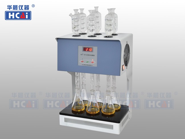 HCA-100标准COD消解器 产品概述: 国家标准HJ828-2017(代替GB 11914-89)分析方法规范地制定了水质化学需氧量COD(cr)的测定步骤,严格地规定了方法的加热消解时间、溶液酸度、氧化剂和催化剂的用量等条件指标。显而易见,水质COD(cr)的测定是有严格的条件规定,违背了条件规定进行操作,就会影响测定的准确性。 HCA-100 标准COD消解器(6管)采用微机技术进行定时控制加热电炉,可对6个24号标准磨口的250mL锥形瓶回流装置同时进行加热。达到节能、减低电力负荷、提高效率的目的。 采用新型稀土合金带状波浪发热丝平板炉盘,表面覆盖可耐800℃高温的微晶玻璃面板,电热丝寿命极长,加热时表面发热均匀,升温、降温速度快。炉盘使用新型的耐高温无机环保隔热材料,底板和周边的热损失小,受热、导热均匀,热效率更高。平板电炉耐高温微晶玻璃面板表面易清洗,样品溶液不小心滴上去,用布擦干就行,可减少操作不当对仪器的损坏。 HCA-100标准COD消解器采用玻璃毛刺回流管代替球形回流管,并以风冷技术取代自来水冷却方式,既可以节水又能使仪器规范化,同时还提高了仪器使用的安全性。仪器的化学溶液配制、操作和COD的计算完全遵照HJ828-2017,低于50mg/L的COD水样可通过稀释滴定剂和氧化剂来提高精确度,高于700mg/L的COD水样,可以通过水样的比例稀释来完成测定。 技术规格: 执行标准:国家标准 HJ828-2017(代替GB11914-89) HCA-100标准COD消解器具体操作步骤: 带有24号标准磨口的250mL锥形瓶加入10ml试样,加入0.250mol/L重铬酸钾标准溶液5.0mL和几颗出厂配置的防爆沸磁珠(不建议使用玻璃珠),摇匀。 |