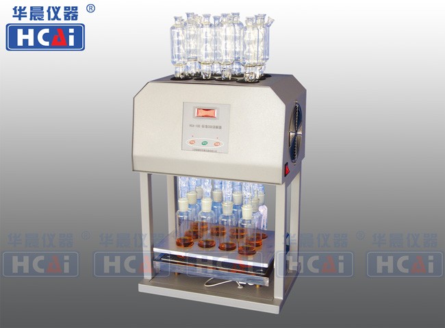 国家标准HJ828-2017(代替GB 11914-89)分析方法规范地制定了水质化学需氧量COD(cr)的测定步骤,严格地规定了方法的加热消解时间、溶液酸度、氧化剂和催化剂的用量等条件指标。显而易见,水质COD(cr)的测定是有严格的条件规定,违背了条件规定进行操作,就会影响测定的准确性。 HCA-100标准COD消解器遵循了国际标准(ISO)和国家标准(HJ828-2017)的基本原则,保证了回流加热微沸2小时的消解操作,试剂溶液的配制和加入量都和国标法一致,确保可靠精确的分析结果。 产品特点: HCA-100 标准COD消解器(10管)采用微机技术进行定时控制加热电炉,可对10个24号标准磨口的150mL柱形瓶回流装置同时进行加热。达到节能、减低电力负荷、提高效率的目的。 HCA-100标准COD消解器采用玻璃毛刺回流管代替球形回流管,并以风冷技术取代自来水冷却方式,既可以节水又能使仪器规范化,同时还提高了仪器使用的安全性。 仪器的化学溶液配制、操作和COD的计算完全遵照HJ828-2017,低于50mg/L的COD水样可通过稀释滴定剂和氧化剂来提高精确度,高于700mg/L的COD水样,可以通过水样的比例稀释来完成测定。 技术规格: 执行标准:国家标准HJ828-2017 消解样品数:10个 消解瓶容量:150ml(24#磨口柱形瓶) 消解样品量:10ml 测量范围:10~700mg/L(大于700m0g/L的水样稀释后测定) 消解时间:10分钟-2小时30分钟(用户可自行调整) 测量误差:邻苯二甲酸氢钾标准溶液(500mg/L)相对标准偏差不大于5.0%; 工业有机废水(500mg/L)相对标准偏差不大于8.0% 环境温度:≤35℃ 加热功率:1250W(AC 220V,50HZ) 仪器尺寸:400mm(L) * 300mm(W) * 560mm(H) 注:关于我司“HCA”注册商标法律声明 具体操作步骤: 带有24号标准磨口的250mL锥形瓶加入20ml试样,加入0.250mol/L重铬酸钾标准溶液10.0mL和几颗防爆沸玻璃珠,摇匀。将锥形瓶接到毛刺冷凝管下端。从冷凝管上端缓慢加入30mL硫酸银-硫酸试剂,以防止低沸点有机物的逸出,不断旋动锥形瓶使之混合均匀。自溶液开始沸腾起回流两小时。冷却后,用30mL蒸馏水自冷凝管上端冲洗冷凝管后,取下锥形瓶,再用蒸馏水稀释至140mL左右(即总加蒸馏水80ml)。溶液冷却至室温后,加入3滴1,10-菲绕啉指示剂溶液,混合均匀。用硫酸亚铁铵标准滴定溶液滴定,溶液的颜色有黄色经蓝绿色变为红褐色即为终点。 |