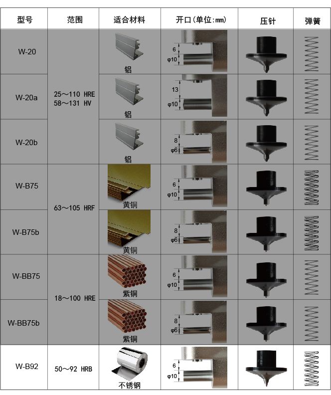 W-B92系列金属韦氏硬可用于检测厚度为6mm以下的软态不锈钢及冷轧钢等。 另有W-20型铝合金韦氏硬度计、W-B75及W-BB75型铜合金韦氏硬度计,分别适用于测试铝合金、紫铜、黄铜等材料的硬度。