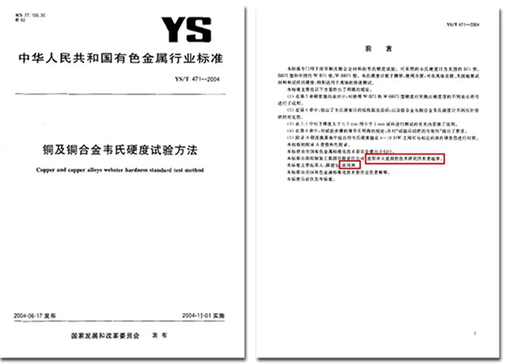 由天星公司参加起草的行业标准YS/T 471-2004 《铜及铜合金韦氏硬度试验方法》