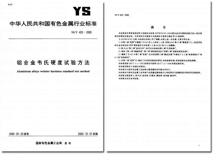 由天星公司参加起草的行业标准YS/T 420-2000 《铝合金韦氏硬度试验方法》