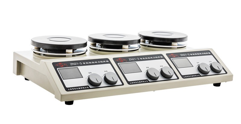 ZN21-3智能恒温磁力搅拌器为单排三工位,每个工位可单独控制。采用无刷电机驱动,转速显示,速度控制采用闭环稳速电路,可控制±1转。控温采用Pid方式自动控温,台面温度、杯内温度均可设定测量显示,可控制±0.1度。定时可长达9999分钟。