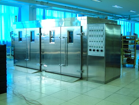 本实验室主要应用于开关元件的恒温老化试验,也可应用于一般物品的干燥,工作室容积为16m3,具有一次性实验容量大、工作稳定、操作简便等特点。 本实验室外壳及内室均由拉丝不锈钢制作,外形美观。内室与外壳中间夹层填充聚氨酯,可同时起到保温与加强内外室强度的功效。实验室底部则设有防滑铝板,可以保证实验室安放后的平稳性。实验室共设有四扇大门,大门上均设有观察窗,工作室内设有4盏照明灯,方便在实验进行时及时了解实验室内试品情况。实验室顶部设有2个可调式排气口,用户可根据实际使用情况来调节排气量。后背安装有2个可调式进气口,从而可满足进行实验时的换气要求。本设备采用不锈钢加热管进行加热,另设有4套鼓风设备。每套鼓风设备均有2台电机与2个离心式叶轮组成,从而可保证实验室内的温度均匀性,确保实验顺利、成功的进行。 产品特点: 1. 本实验室风路方式为热风循环方式,风路设计**地保证了工作室内形成良好的气流循环。鼓风装置的出风口装有风栅,风栅可将热空气分为数道气流并均匀的送入工作室,用户叶可根据实际情况调节风栅来达到控制热空气喷出的位置。 2. 本实验室采用库板拼装式结构。库板连接方式采用内部连接件连接,具有表面无连接痕迹,连接强度高等特点。箱体前方共设有4扇独立的大门,分别设有锁紧装置,互不影响,均可独立开启。大门上设有观察窗,配合工作室内的4盏照明灯,可对实验室内试品进行观察。 3. 根据热空气自然上升原理,排气口设置于箱体顶部,可保证因实验产生的气体自然排出工作室内而不影响实验的进行。 4. 箱体后背设有进气孔直通箱体加热室内,其位置位于加热器下方,在叶轮形成的上升气流影响下,外部新鲜空气可顺利进入加热室,新鲜空气再进入工作室前必先经过加热器,再被风叶送入工作室,这样可减少外部“冷空气”对工作室内温度均匀度的影响,同时这样的设计既方便于设备整体的装配又方便日后的维修与保养。 5. 数显控温,设定方便,控制精确,配有打印装置,随时监控工作室内温度曲线;多路电气控制,并与推车控制电路相连,以方便观察、调节、控制各个测试点的温度。 6. 配有声光超温报警装置及漏电保护装置,以增加设备的安全性能。 技术参数