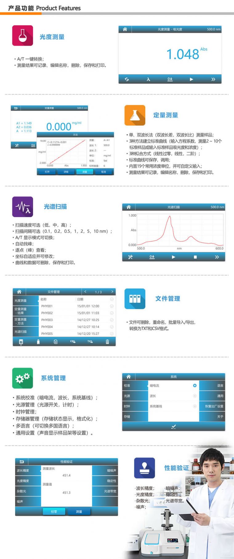 PV4 单光束 可见分光光度计。通过简单的参数设定,方便地进行光度分析、定量分析、动力学测试,配合专业的Mapada的扫描分析软件,可实现全多波长测试。