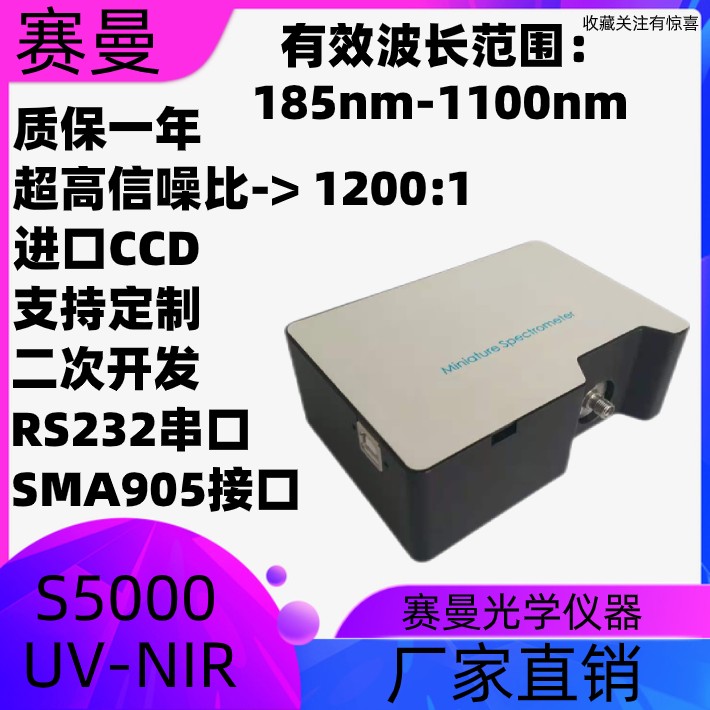 S5000-UV-NIR光纤光谱仪是一款小型化产品,适合于工业和科研中的宽光谱测量应用。S5000-UV-NIR配备的传感器,可将单台光谱仪的探测范围扩展至185nm-1100nm超宽波段,同时满足紫外到近红外的测量。