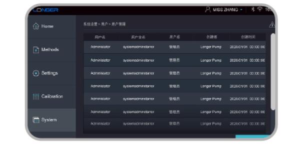 分别指示:待机/运行/故障停机 支持21CFR安全法规要求,确保电子数据的有效性和可靠性 支持三级⽤⼾权限管理,不同⽤⼾不同显⽰或操作权限 记录泵的运⾏历史数据,保存为⽇志且可直接导出 电⼦签名和审计追踪,真实完整记录运⾏数据
