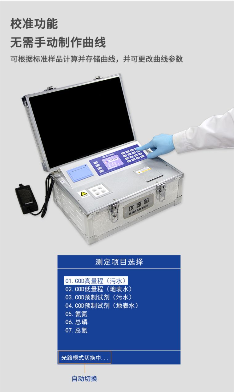 8.野外便携:便携式设计,搭配专业配件箱、高能锂电池,实现野外无电源条件下测量,最多可连续消解60支COD水样。