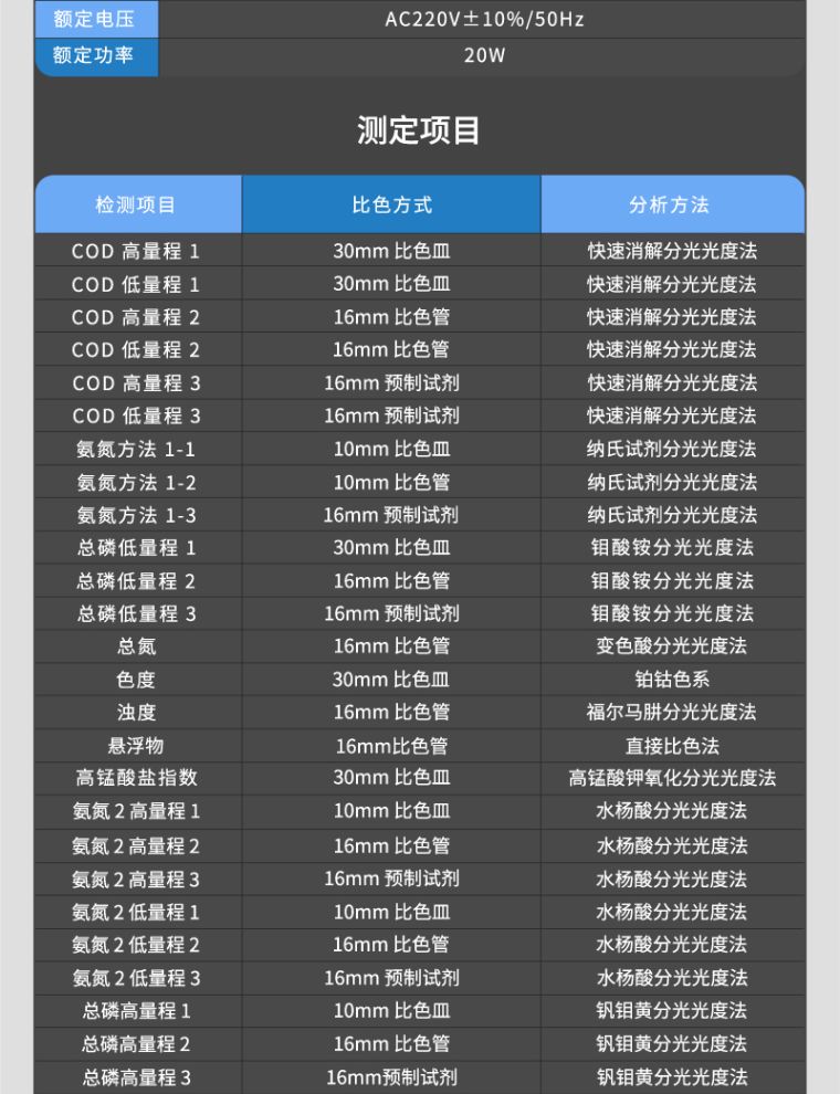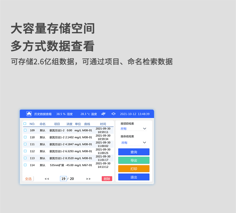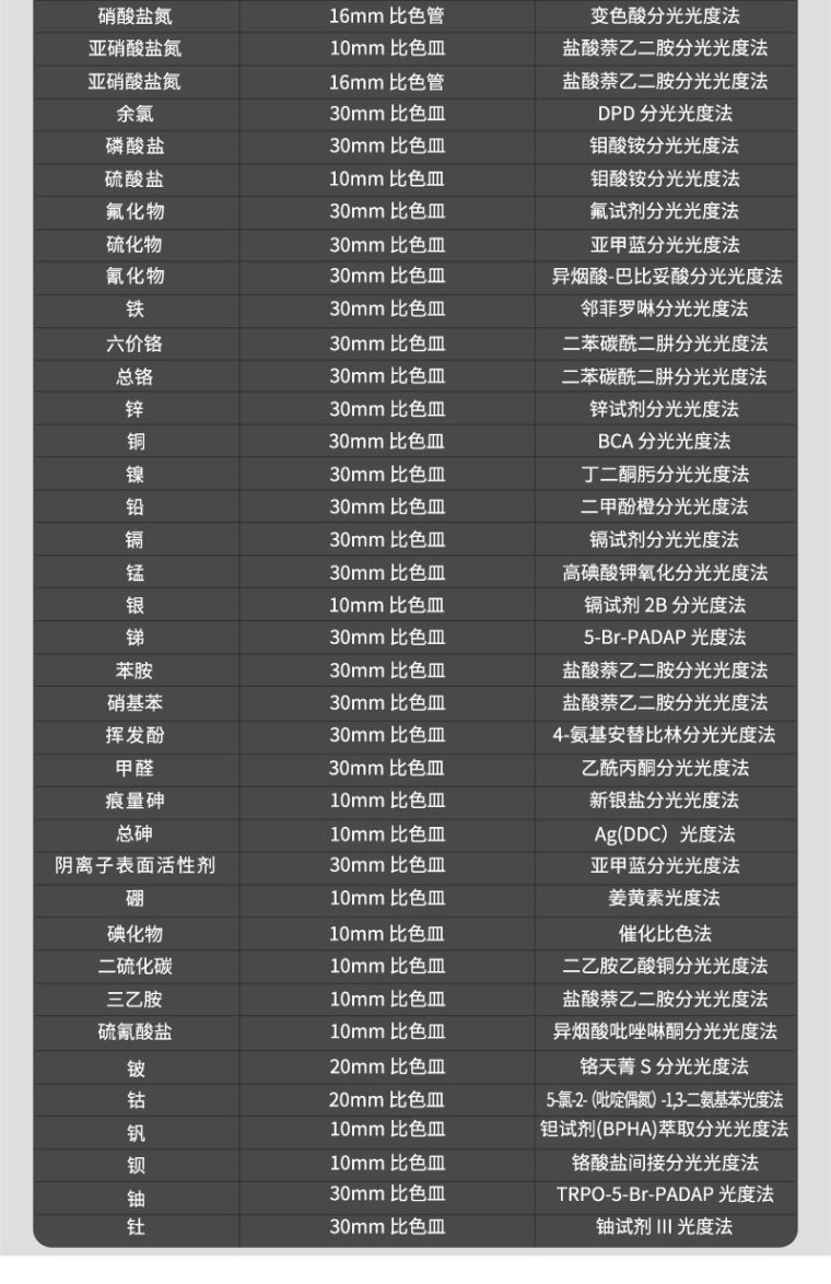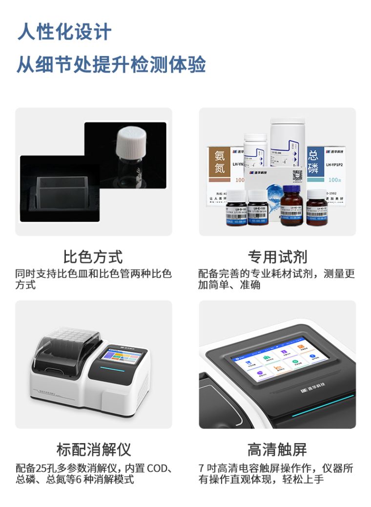 功能特点 1、自主研发的Lhos连华水质检测系统搭配7吋高清液晶触屏,全中文操作界面,人性化操作设计,在水质检测领域“检而不凡”; 2、支持10mm、30mm皿比色和φ16mm管比色三种比色方式,同时管比色增加360°旋转管比色,确保测量的准确性; 3、仪器支持程序外部升级,具有无线通讯功能,数据亦可通过数据线连接PC端导出或通过U盘导出; 4、多功能样品管理,可对样品进行命名,方便样品记录和数据存储;稀释倍数可提前输入,结果自动计算; 5、仪器可**存储约2.6亿组(5G)数据,为方便大量数据查找,可通过项目、命名、时间检索,并随意选择分析; 6、庞大的数据分析功能,可同时分析多组样品和不同指标样品,并对数据进行平均值、最值、相对标准偏差等方式分析; 7、仪器增加权限管理功能,用户角色可分为管理员和操作员两种角色,不同角色对仪器具有不同的操作权限,方便用户日常管理仪器,并保证数据的安全性; 8、8光路智能调节,可自动根据检测项目自动进行通道定位、光路能量增益和光路系数补偿等参数调节; 9、多方式人机交互的引入,从而支持语音播报,蜂鸣提示和指示灯提醒等交互功能;仪器内置操作视频和操作指南,屏幕显示大小和亮度均可调节; 10、内置温湿度检测模块,直接仪器内显示温湿度数据,并可直接打印在原始数据上,保证检测结果的可溯性; 技术参数 1.性能参数 1.1波长参数:420nm 510nm 535nm 545nm 560nm 610nm 669nm 700nm 示值误差:COD(≤50mg/L):≤±8%;COD(>50mg/L):≤±5%; 氨 氮(≤2mg/l)±0.2mg/l (>2mg/L):≤±5%; 总磷:≤±5%; 重 复 性:≤±2%;光学稳定性:<±0.005A/20min; 2.物理参数 2.1仪器尺寸:主机:420*300*181; 2.3显示屏:7寸彩色液晶触摸屏; 2.4操作界面:中文操作; 2.5比色方式:30mm比色皿、10mm比色皿、16mm旋转管比色。 2.6打印机:热敏行式打印机; 2.7数据通讯口:USB程序刷新口、typeC数据传输口、无线通讯模块; 2.8 63个常规项目、8个扩展项目 2.8曲线数量:710条标准曲线、355条拟合曲线 2.9数据存储:5G存储内存、可存储历史数据2.6亿组。 2.10毛重:15.3kg 2.11仪器包装箱尺寸:(525*405*410)mm 3.环境及工作参数 3.1环境温度:(5~40)℃; 3.2环境湿度:相对湿度≤85%RH(无冷凝); 3.3额定电压:AC220V±10%/50Hz; 3.4额定功率:20W(光路转动18W平常工作12W) |