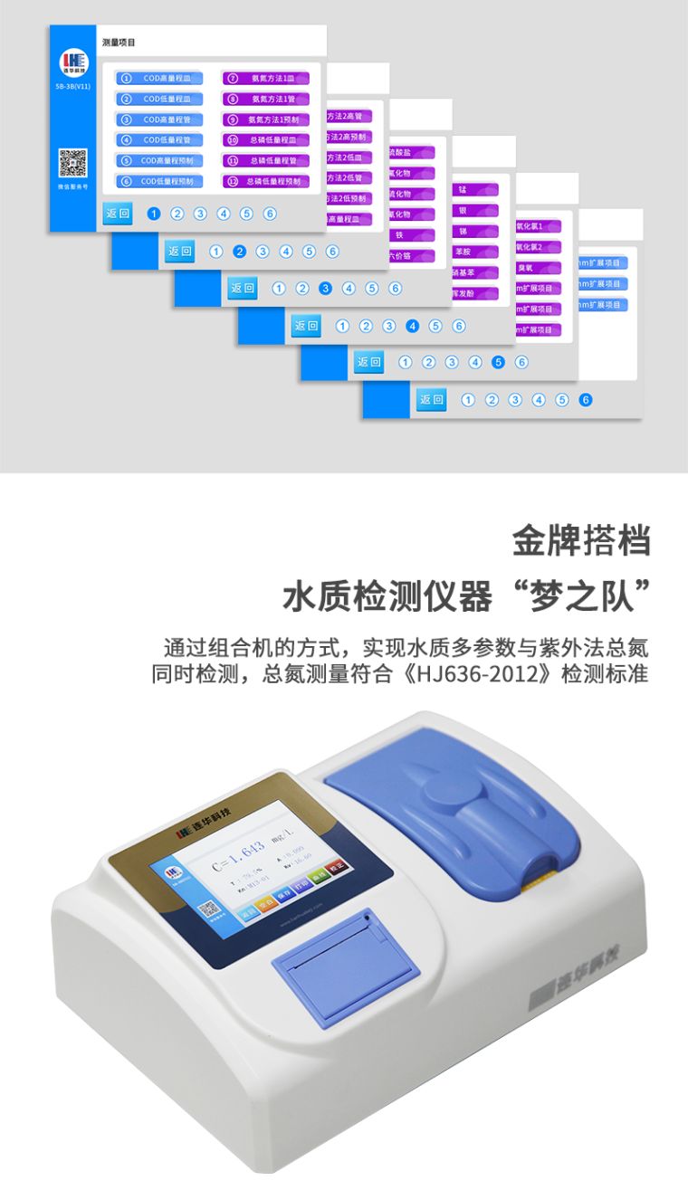 1、五十余项参数指标:直接测定化学需氧量(COD)、氨氮、总磷、总氮、悬浮物、色度(铂钴色系)、浊度、重金属、有机污染物和无机污染物等多项指标,浓度直读;