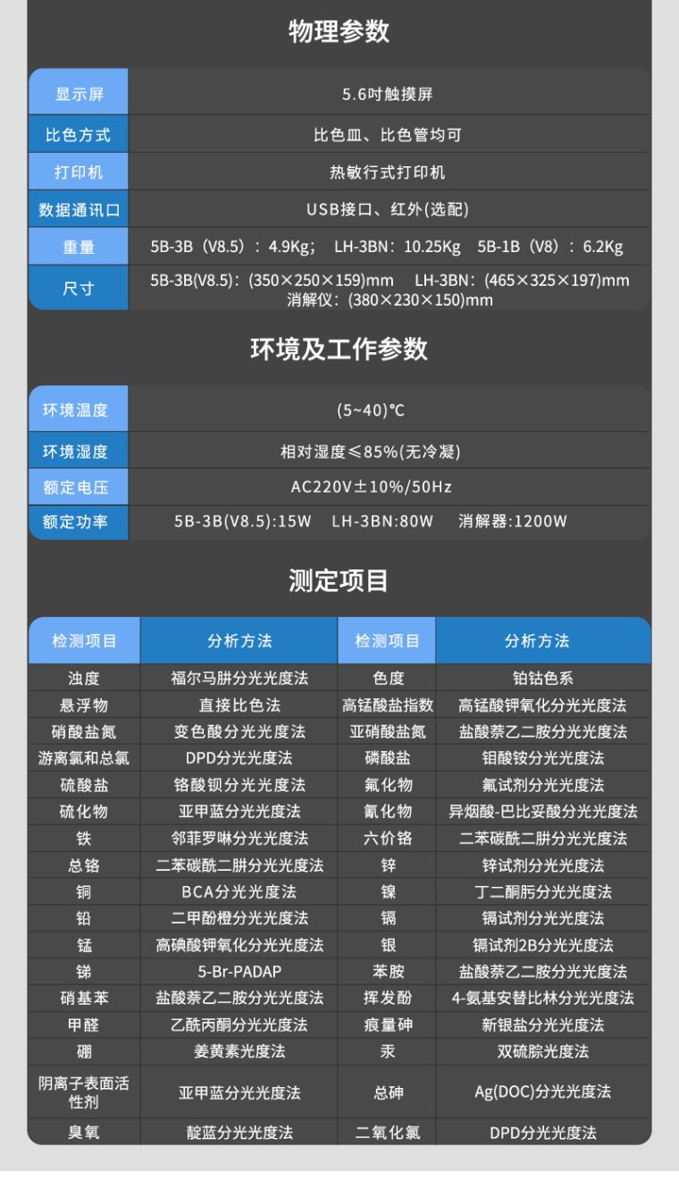 | 重 量 | 主机:5B-3B(V8.5):4.9Kg;LH-3BN:10.25Kg 消解仪:5B-1B(V8):6.2Kg | 尺寸 | 5B-3B(V8.5):(350×250×159)mmLH-3BN:(465×325×197)mm消解仪:(380×230×150mm |
