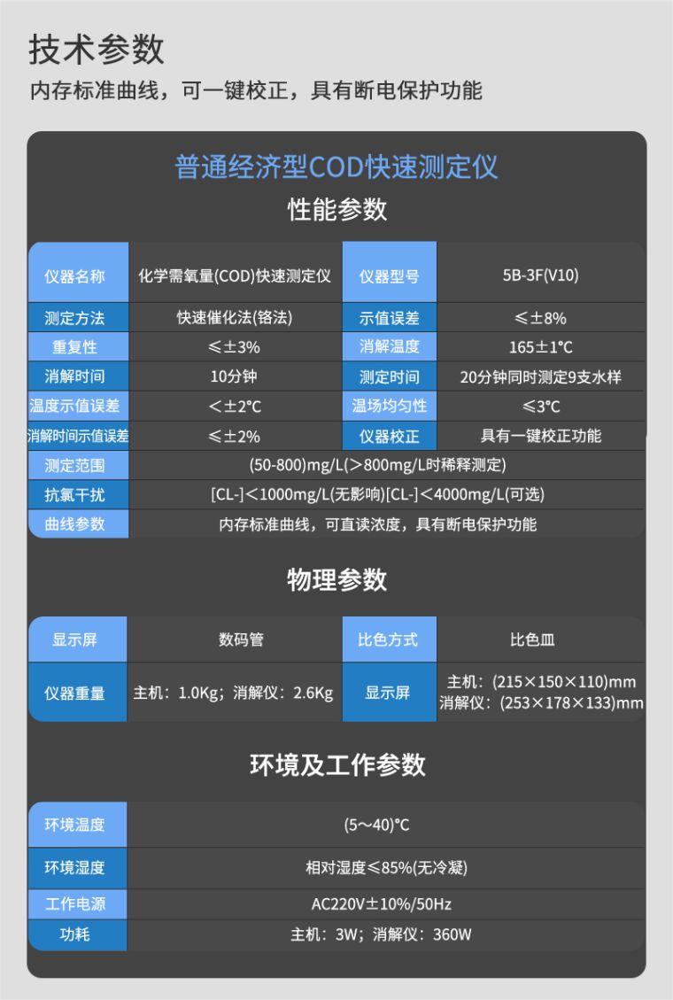 2.1仪器尺寸:主机:(215×150×110)mm;消解仪:(253×178×133)mm