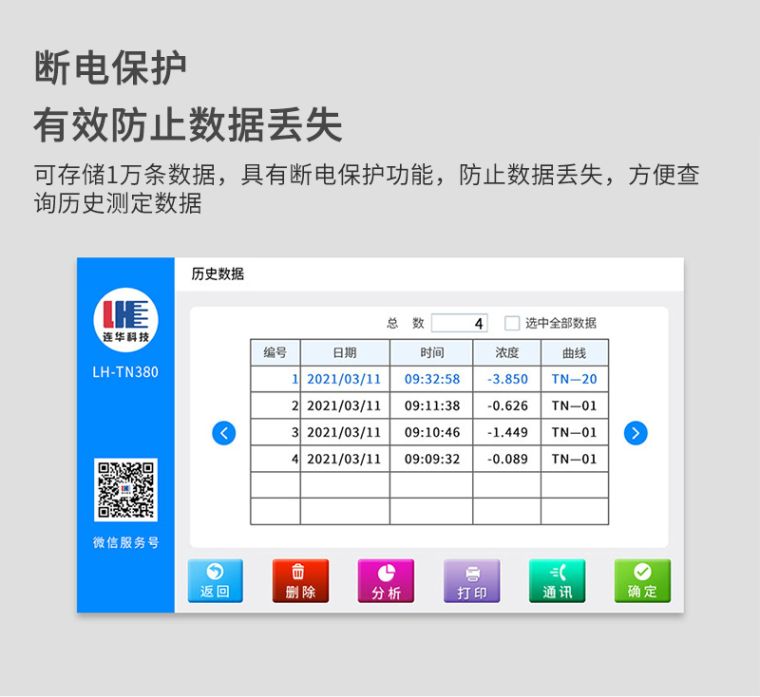 7、断电保护:可存储1万条数据,具有断电保护功能,防止数据丢失,方便查询历史测定数据;