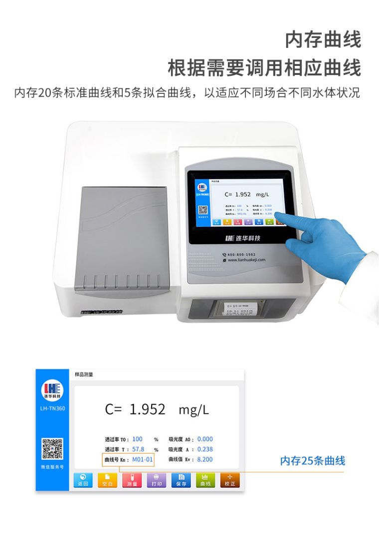 功能特点 1.符合标准:符合环境标准《HJ363-2012 水质 总氮的测定 碱性过硫酸钾消解紫外分光光度法》; 2.显示界面:7吋彩色液晶屏显示,支持中文/英文显示(选配),设计友好智能,浓度直读,方便操作; 3.性能稳定:采用进口氘灯光源,光学性能稳定,检测结果准确; 4.内置曲线:预留25条曲线(其中20条标准曲线,5条拟合曲线)以适应不同场合不同水体状况; 5.专用耗材试剂:配备专用固体、液体试剂耗材,操作更加简单、安全、准确; 6.断电保护:可存储1万条数据,具有断电保护功能,防止数据丢失,方便查询历史测定数据; 7.帮助界面:内设帮助界面,提示用户检测过程及常规注意事项; 8.数据打印/传输:可打印当前数据和历史储存数据,即时打印数据及测量波长,支持红外、USB,可与PC段进行数据传输。 技术参数 1.产品名称:总氮测定仪 2.产品型号:LH-TN360 3.测定范围:(0~100)mg/L(分段) 4.显示模式:浓度:C;透光率:T%;吸光度:A; 5.示值误差:≤±5% 6.曲线数量:25条 7.稳定性:≤0.002A/30分钟 8.数据存储:5000组 9.数据通讯口:USB/红外传输 10.打印机:热敏式打印机 11.线性系数:R2≥0.999 12.波长重复性:<0.5nm 13.波长准确度:±0.6nm 14.仪器重量:14Kg 15.额定功率:65W 16.额定电压:AC220V±10%/50Hz 17.仪器尺寸:(460×385×223)mm |