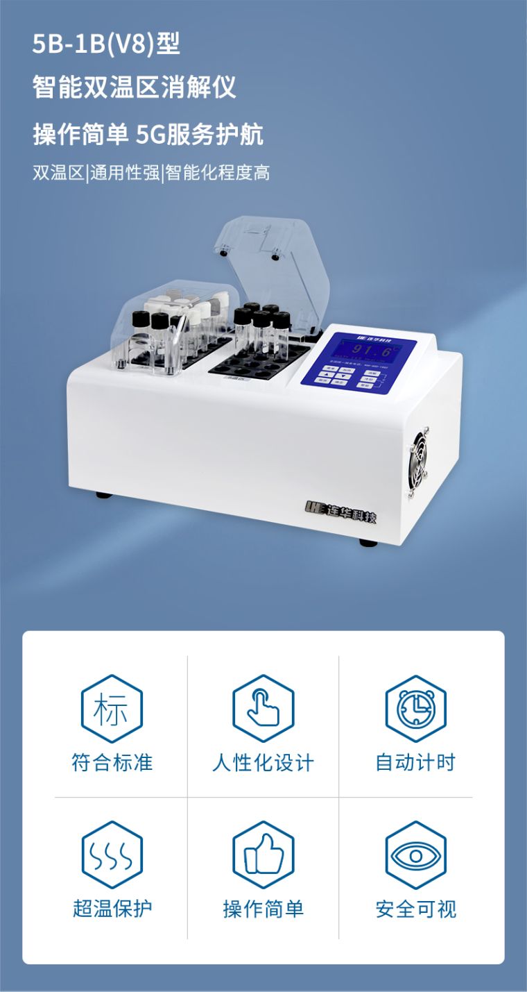 1.安全可靠:全透明一体化耐热保护罩,既可以直接观察水样状态,又保证消解安全可靠;