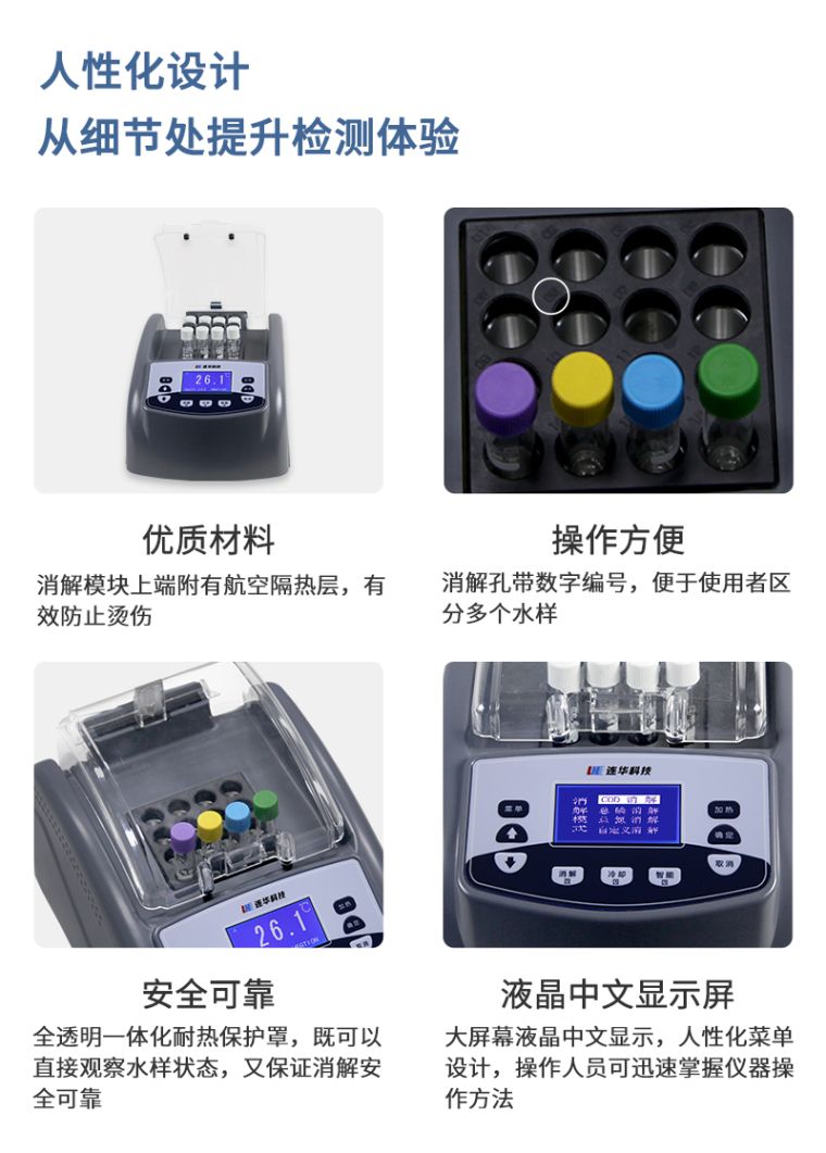 1.安全可靠:全透明一体化耐热保护罩,既可以直接观察水样状态,又保证消解安全可靠;