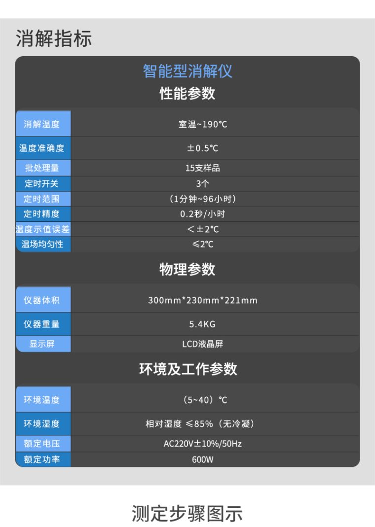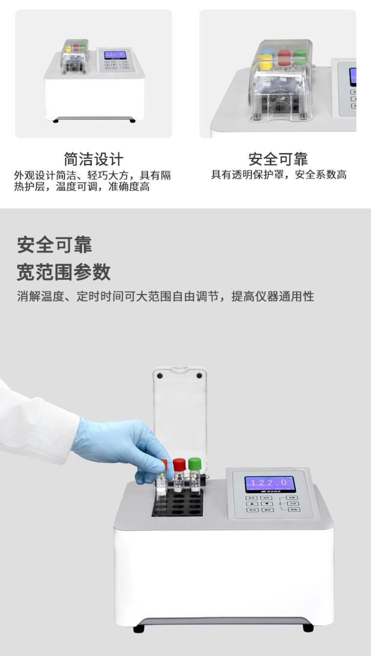 功能特点 1、安全可靠:全透明一体化耐热保护罩,既可以直接观察水样状态,又保证消解安全可靠; 2、优质材料:消解模块上端附有航空隔热层,有效防止烫伤; 3、中文显示:液晶屏显示,人性化菜单设计,操作人员可迅速掌握仪器操作方法; 4、宽范围参数:消解温度、定时时间可大范围自由调节,提高仪器通用性; 5、智能加热:消解温度到达时自动调整加热功率; 6、延时保护:可预设开机加热时长,到达预设时间时自动停止加热,节省能耗; 7、智能消解:水样放入后进入等待状态,当温度上升至设定消解温度后自动开始计时,使用户一键轻松计时; 8、方便操作:消解孔带数字编号,便于使用者区分多个水样。 技术参数 1.仪器名称:智能消解仪 2.仪器型号:5B-1F(V10) 3.预存消解程序:COD、总磷、总氮 4.显示方式:液晶 5.定时开关:3个 6.加热速度:10分钟内升到设定温度165℃ 7.定时精度:1秒/小时 8.消解数量:15支 9.消解管直径:16mm 10.消解液体高度:80mm 11.升温完成报警提示:支持 12.仪器过热保护:支持 13.消解保护罩:全透明一体化安全防护 14.操作按键:9位 15.消解温度:室温~190℃(用户可自行设定) 16.温度准确度:±1℃ 17.防酸外壳:耐腐蚀 18.消解容量:(0~10)mL 19.消解管高度:150mm 20.超温报警提示:支持 21.消解防护板:防止因误操作造成烫伤 22.额定电压:AC220V/50Hz市政电源 23.用途:可用于COD、总磷、总氮等消解 |