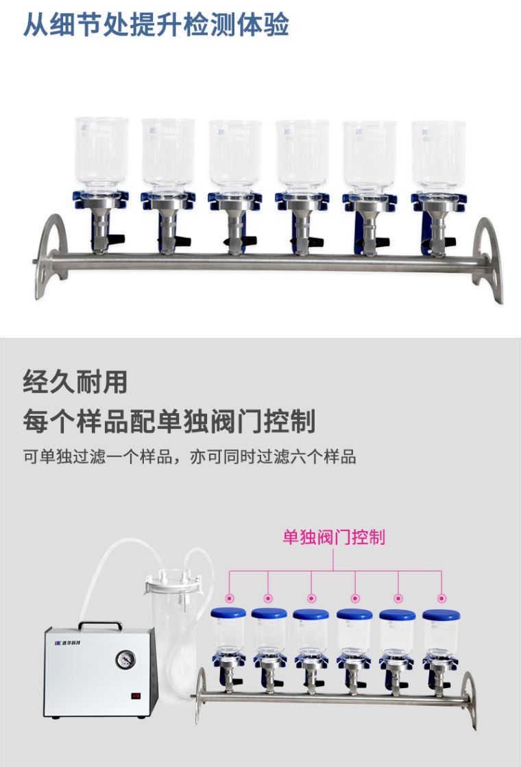 3、每个样品配单独阀门控制,可单独过滤一个样品,亦可同时过滤多个样品;