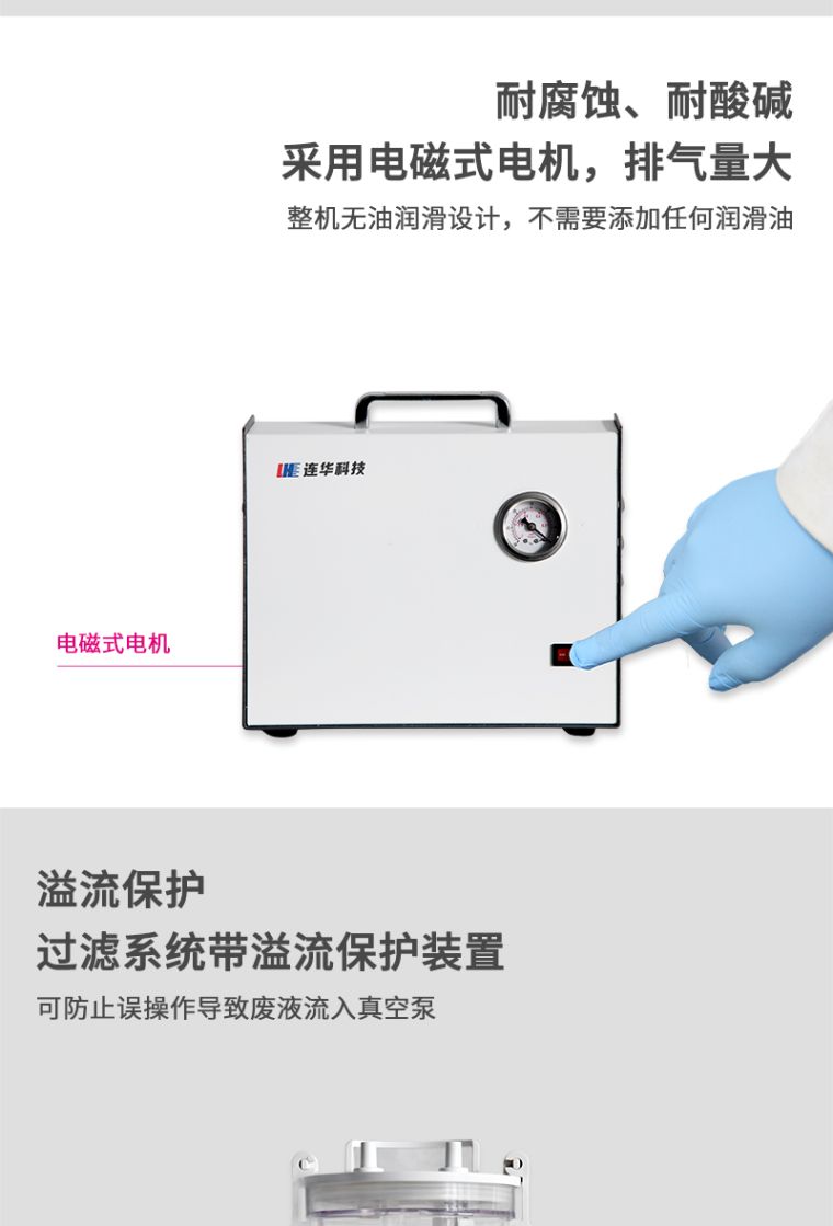 7、过滤系统带溢流保护装置,可防止误操作导致废液流入真空泵;