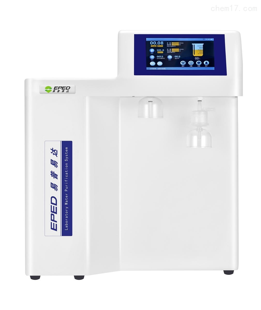 特点与优势 ●以自来水为源水直接生产纯水和超纯水的一体化系统; ●控制器采用的32位微功耗处理器作为控制核心,具备超高运算速率、低功耗的特点。采用先进的 EMC 电磁兼容设计,具有抗干扰能力强,噪音小的特点,同时具备较强的浪涌防护能力,使控制器可靠、稳定、长期的运行; ●采用美国陶氏 DOW * RO 膜,自动,手动冲洗,循环功能,延长 RO 膜使用寿命,保持纯水机的低细菌污染状态; ●电导率仪电阻池常数:0.01cm -1 ,温度灵敏度 ±0.1℃,带温度自动补尝功能; ●全智能控制系统,支持多用户使用、独立计价,工厂、客户二级密码,系统设置均由密码保护,防止未经授权的更改; ●全系统运行异常 ( 源水、预纯化水、超纯水的水质水量 ) 线上自我诊断,警示或系统自动停止运行,系统重要零组件 ( 电磁阀、增压泵、UV 灯、传感器等 ) 智能故障判断,线上更换指示; ●兼容压力水桶和液位水箱 2 种纯水储存方式,可直接显示水箱储水量,满足不同的应用需求; ●采用低压 24VDC 为主电源供电,符合安全规范,ABS 工程塑料机箱,水电分离结构,满足潮湿环境使用,不会对人身造成伤害,超低辐射,纯水管路、接头均获 NSF 认证; ●根据使用要求,取水终端有多种终端精致器可选配,有效去除特定污染物,如去除内毒素和核酸酶、超痕量有机物、内分泌干扰素EDS、挥发性有机物VOC等,以满足不同的实验要求。●7.0 寸彩色触摸电容屏,动画式菜单,操控简单;支持中、英文双语言界面切换,方便用户查看;配备红外线遥控器,一键开关机,一键取纯水、超纯水,一键循环、冲洗;标配压力传感系统,实时显示RO膜压力数值;标配航空接头快插式脚踏开关,方便用户取水;自带WIFI模块,手机APP支持IOS及Android系统用户,连接查看在线数据(选配) ●多点全线监控,在线 3 路水质监控,实时监测源水、RO 反渗透水、DI 去离子水 /UP 超纯水水质;水温在线检测; ●定时、定量、定质取水功能,纯水 / 超纯水各自定量取水,取水量自由设定,精确度能达到 ±2ml。定量(10-9999ml)、定质(1~18.2MΩ.cm)。真彩显示屏在线显示取水水质、取水总量及流速,一目了然。 ●系统时间设定(年 / 月 / 日 / 时 / 分)功能,且具备定时待机(0~60min)、定时关机(0~24hour)功能; ●全系统所有监控数据实时采集,线上查阅,无需外接电脑储存,数据储存量可达一年以上。配备USBHost 接口,支持历史告警记录和历史取水记录的数据导出功能; ★采用日本*冷阴极紫外杀菌设备,此设备具有: 1.合金电极,无灯丝构造 2.ON/OFF反复开关不会影响寿命 3.寿命更长(寿命可达50,000小时) 4.体积更小(管径:Φ4.0mm、管長:150mm) 5.双波长(185nm&254nm),彻底杀菌+降解TOC 6.有非常强的耐震性能,独特的杯状电极,不会因为受冲击而断裂,彻底杜绝因物流原因造成紫外灯灯管摔坏,机器不能正常工作的现象 ●160*80*390mm一体化两柱纯化组模块及160*160*390mm*的超大容量四柱一体超纯化柱组模块。全身柱体采用食品级 PP 材质,热熔设备一次热熔成型,无任何粘接剂,无任何杂质析出。内装3L+5L美国陶氏DOW*纯化精密级树脂及核子级树脂,出水水质可达到 18.2MΩ·cm。 ●根据使用要求,取水终端有多种终端精制器可选配,有效去除特定污染物,如去除内毒素和核酸酶、超痕量有机物、内分泌干扰素 EDS、挥发性有机物 VOC 等,以满足不同的实验要求。
