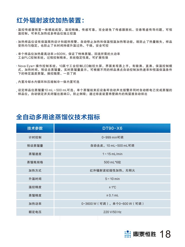 ·采用红外辐射波纹线性加热装置代替传统大功率电热板、电热炉加热,将功率可调加热系统、循环冷凝系统、终端控制系统、防倒吸系统一体结合,具 ·同时采用智能蒸馏终点自动控制、内置式冷却水自动降温、回流装置以及独特设计的自卸压冷凝管馏出分区控制等自主研发技术,实现了操作简单、全自动蒸馏、美观实用、节能降耗、安全随需等性能