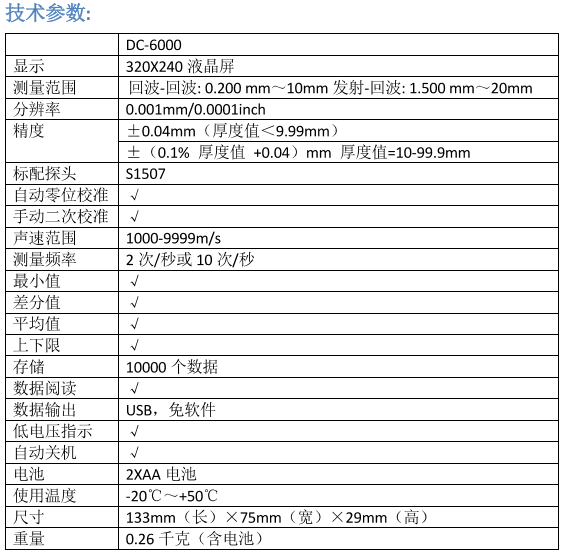 产品特点 1. A/B扫,大屏彩色显示 320×240 2. 分辨率 0.001 mm,测量范围:回波-回波:0.200mm-10mm,发射-回波:1.500mm-20mm 3. 标准配置 15MHz 单晶探头 S1507,特别适用于超薄件,高精度测量 4. 探头自动识别和自动零位校准 5. 自动定位底面回波 6. 自动测量和手动测量可选 7. 100文件 X 100 个数据/文件夹, 8. 数据传输无需软件,适用于任何Windows操作系统 9. 用户移除探头,测量数据冻结于液晶屏上,方便用户查看 技术参数