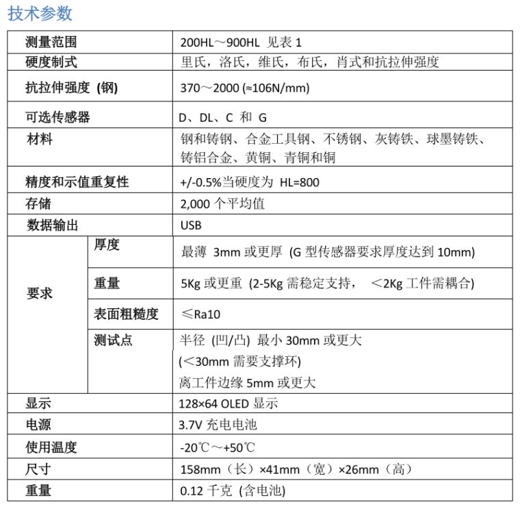 产品特点 1. OLED 显示128×64 2. 测量范围 200~900HL 3. 高精度和示值重复性±0.5% 硬度值=800HL 4. 满足硬度 ASTM A 956标准 5. 标准配置D型传感器,可选配 DL、D+15、 C 和 G 型传感器,满足不同应用场景 6. 全角度测量,自动识别测量方向和角度,无需设置 7. 基于里氏硬度,可转换为洛氏、布氏,维氏,肖式等硬度制式 8. 多语言和多国硬度转换标准 技术参数
