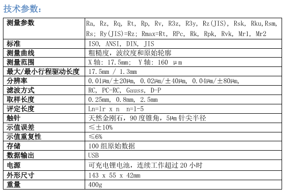 3. Ra, Rz, Rq,Rt, Rp, Rv, R3z, R3y, Rz(JIS), Rs, Rsk, Rsm, Rku, Rmr, RPc, Rk, Rpk, Rvk, Mr1 and Mr2共20个测量参数