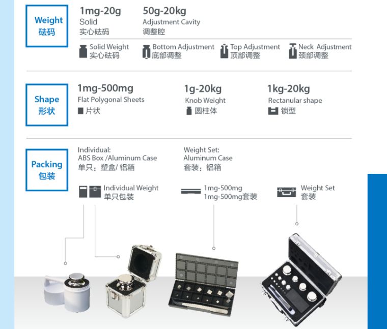 生产标准:OIML-R111,JJG99-2006砝码检定规程 材质:不锈钢 结构:1mg-20g实心,50g-500g调整腔 密度:7.9g/cm3 磁化率:<0.05 极化强度:<250 形状:1mg-500mg片状,1g-500g圆柱形 砝码数量:24只 砝码组成:1mg,2mg,2mg,5mg,10mg,20mg,20mg,50mg,100mg,200mg,200mg,500mg 1g,2g,2g,5g,10g,20g,20g,50g,100g,200g,200g,500g 包装:铝盒 包装尺寸(cm):270*220*100 含铝盒重量(kg):2.2 附件:镊子,刷子,擦拭布 适用于:检定分辨率<6000d的天平(分辨率=最大称量/可读性)