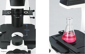 BDS400倒置生物显微镜 BDS400倒置荧光显微镜 性能特点 长工作距离聚光镜N.A.0.30,工作距离72mm 移除聚光镜,工作距195mm,于观察超高培养瓶