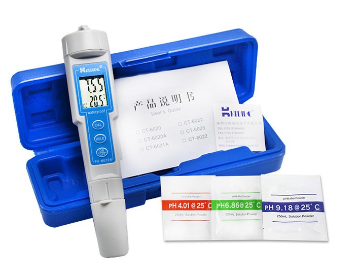 1.敬请在使用此仪器前,详细阅读此说明书; 2.仪器的玻璃电极为易碎品,取下保护帽后要小心使用,因为任何破损或擦毛都可能使电极失效! 3.玻璃电极的保质期为一年,出厂一年以后,不管是否使用,其性能都会受到影响,应及时更换; 4.玻璃电极在干燥状态下是不能正常使用的。使用前请用蒸馏水或者纯净水浸泡玻璃电极10-30分钟使电极活化。 5.仪表开机时显示屏上显示的是本机型号,随后进入测量状态 特点 | 测量范围0.00--14.00pH | LCD液晶双显示pH值和温度值 | | 包括电极在内的一体式数字笔式pH计,方便使用 | 显示锁定功能(HOLD) | | 全防水设计 | 体积小,重量轻 | | 配备pH4.01,pH6.86,pH9.18的标准缓冲液 | 配有1.5V电池(LR44,BAT) x4pcs | | pH电极更换方便快捷,降低使用成本 | 使用范围广阔 | | 自动温度补偿,可在温度变化的情况下保证精确性 | 10分钟自动关机功能 | | pHpH4.01,pH6.86,pH9.18三点校准 | ℃/℉温度单位可选 | | CT-6023L带有智能背光灯,感应系统可以根据周围光线水平自动开启或关闭LED背光灯 |