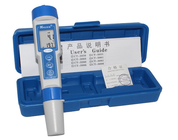 产品特点: CT—3086笔式电子盐度计采用了单片机技术,LCD显示,自动温度补偿和温度显示功能,一点校正。包括电极在内的一体式数字笔式电导,并且电极可以更换,外壳防水设计。盐度计技术指标: