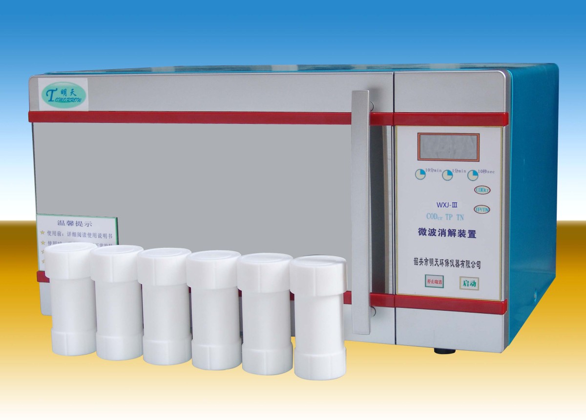 适用范围及主要用途 WXJ-Ⅲ(CODcr、TP、TN)微波消解装置可对各种地表水、生活污水、工业废水中化学需氧量(CODcr)、总磷(TP)、总氮(TN)进行快速高效消解测定。 广泛适用于各级环保部门,水资源管理部门及公共卫生部门对水质的鉴定与管理。 产品特点 · 公开所用试剂配方,用户无须购买耗材。 · 密闭消解,超压保护,安全可靠,消解完成蜂鸣提示。 · 可消解多种物质:化学需氧量(CODcr)、总鳞(TP)、总氮(TN) · 省时、省费用、操作简单方便。 · 用于CODcr消解时: A、具有抗氯离子干扰的能力,能测定CODcr值大于50mg/L,氯离子含量高达10000mg/L的水平。 B、可测定10mg/L以下CODcr值 技术参数: