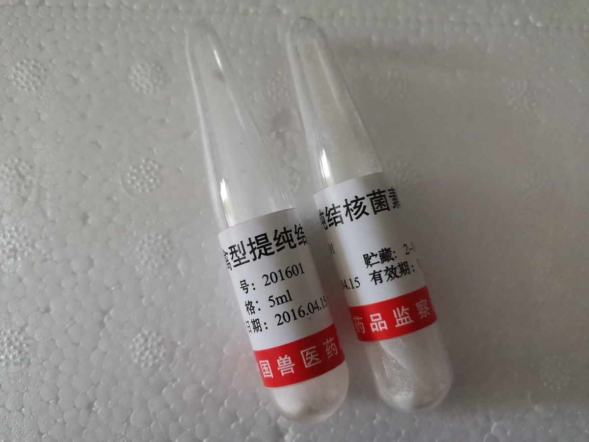 【主要成分及含量】含有经灭活、提纯的鼻疽伯氏菌(CVCC67001、CVCC67002)。 【性状】乳白色或略带淡棕黄色疏松团块,易与瓶壁脱离,加稀释液后迅速溶解成无色或略带淡棕黄色澄明液体。 【作用与用途】用于诊断马属动物鼻疽。 【用法与用量】点眼法 冻干提纯鼻疽菌素按瓶签注明的装量用生理盐水稀释,进行点眼,滴入量为3~4滴,点眼后经3、6、9及24小时判定,判定标准如下: 强阳性反应 “+++’’ :眼反应特别明显,上下眼睑互相胶着,出现大量脓液。 阳性反应“++”:眼睑浮肿,眼睛呈半开状态,出现中等量的脓性眼眦。 弱阳性反应“+”:眼结膜发炎,浮肿明显,并含有少量的脓性眼眦,或在灰白色黏液性眼眦中混有脓性眼眦。 可疑反应“±”:眼结膜潮红,有弥漫性浮肿和灰白色黏液性(非脓性)眼眦。 阴性反应“-”:点眼后没有反应或结膜轻微充血及流泪。 阴性和可疑反应的马、驴、骡,经过5~6日后重检。重检时,在第1次点眼的同一眼睛内滴入鼻疽菌素3~4滴,经3、6、9、24小时后,分别按前述标准判定结果。 皮内注射法 应用提纯鼻疽菌素进行。 1、注射部位及术前处理:在颈侧中部上1/3处的健康皮肤剪毛(或提前1日剃毛),直径约为10cm,用卡尺测量术部中央皮皱厚度,作好记录。注射前局部消毒。 2、注射方法和剂量:用生理盐水将提纯鼻疽菌素稀释成0.5mg/ml的浓度,不论动物大小,一律皮内注射0.1ml。注射部位应出现小泡,如有疑问,应另选15cm以外的部位或对侧重新注射。 3、判定:注射后72小时判定,仔细观察注射部位有无热痛、肿胀等炎性反应,并用卡尺测量皮皱厚度,作好详细记录。判定标准如下。 阳性反应“+”:局部有明显的炎性反应,皮厚差不低于4.0mm。 可疑反应“±”:局部炎性反应不明显,皮厚差为2.1~3.9mm。 阴性反应“-”: 局部无炎性反应,皮厚差不高于2.0mm。 如局部确有一定程度的炎性反应,即使皮厚差在2.0mm以下,仍应判为可疑反应。 对可疑反应的动物,可于72小时判定后,即刻在另—侧用同一批菌素同一剂量进行第2次皮内注射,注射后72小时判定。 【不良反应】一般无可见的不良反应。 【注意事项】 1、用水(或生理盐水)稀释后限当日用完。 2、采用点眼法时,应先检查动物眼睛,确保无眼病,以免影响判定结果。