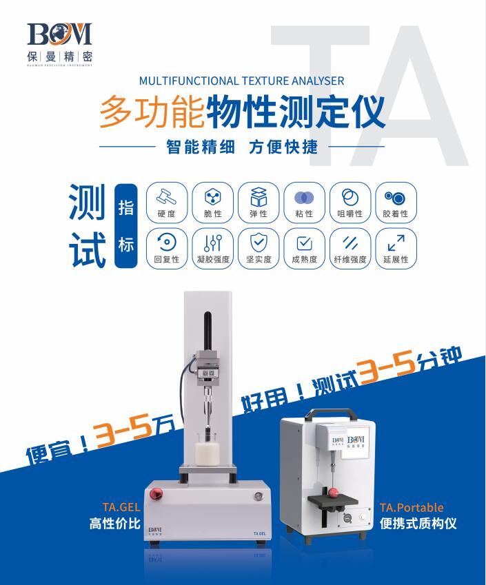 保曼精密鱼糜弹性测定仪产品优势特点: 1.性价比高,仪器功能和应用和进口质构仪相同,而价格是进口仪器的三分之一。 2.探头和配件可以和进口仪器通用。 3.第三方校准:可以使用标准砝码进行校正。 4.精度高:测试精度为0.01克,和进口仪器相当。 5.仪数据采集率高:数据采集率:不低于500组/秒,每组4个通道同时读取。 6.操作便捷:软件带有控制键,无需用手接触仪器,只需点击鼠标可以进行仪器各种操作 ;也可安装触屏装置,无需搭配电脑即可自行操作。 7.应用领域广阔:各种种类、形态鱼糜的弹性测定、鱼糜凝胶强度测定、肉糜凝胶强度测定。