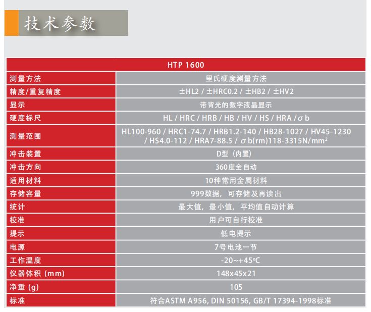 HTP1600是一款集成了冲击装置与处理器于一体的先进的笔式硬度计,同时采用我公司的研发的双线圈技术使仪器的测量精度得到显著提高。我公司生产的全角度数字探头,任意方向测试,无需手动测试方向。仪器配有USB接口,可连接电脑输出测试数据并生成报告。该仪器具有简单易用的菜单设计,用户无需说明书即可操作。 技术参数 1.双线圈无线数字探头,重复精度可达±2 2.全角度测量,无需手动测试方向 3.高对比度数字液晶 4.可储存999组测试数据并读出 5.用户可自行校准 6.统计数据可自动计算 7.带有强度换算功能 8.USB接口数据传 |