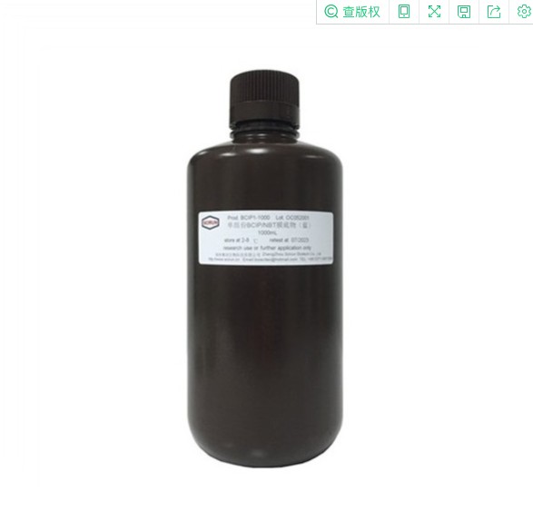 单组份BCIP/NBT膜底物为常用的碱性磷酸酶(AP)底物之一,根据产品组分不同,其反应产物为深蓝色或深紫色沉淀。BCIP/NBT底物具有灵敏度高而本底较低的优点,常用于Westernblot,条带免疫印迹等免疫检测领域。 本产品为即用型底物,含有BCIP(5‐romo‐4‐chloro‐3‐indolyl phosphate)和NBT(nitroblue tetrazolium)。未反应的底物为无色至浅黄色,当底物与碱性磷酸酶接触反应时,生成不溶于水的深蓝色反应产物。 外观:淡黄色液体 BCIP2-0100(100mL) 即用型底物,含有BCIP(5‐romo‐4‐chloro‐3‐indolyl phosphate)和NBT(nitroblue tetrazolium)。未反应的底物为无色至浅黄色,当底物与碱性磷酸酶接触反应时,生成不溶于水的深紫色反应产物。 外观:淡黄色液体 本产品在科研院所、IVD厂商中广泛使用!欢迎联系获取您的优惠报价! |