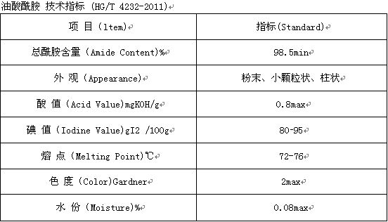 油酸酰胺,采用高品质植物油酸为原料,通过合成与提纯等精细工序制得本品,不溶于水,在醇、酯、酮、苯