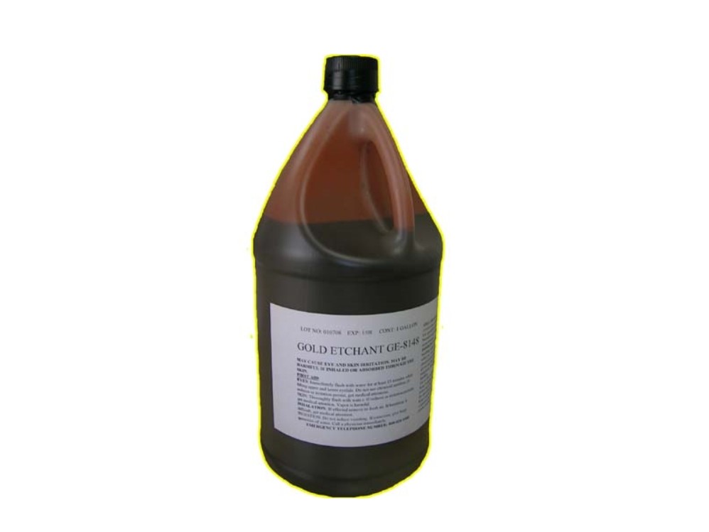 应用 将水加热于50℃以帮助溶解。在每加仑去离子水中加8盎司金蚀刻剂TFAC粉,蚀刻导体图案去除金膜,蚀刻时间长短依膜厚度而定,保存蚀刻废液回收其中的金。 废液处理:分离溶液。氰化物小心按照国家和地方有关规定处理。 金蚀刻剂GE-8110和GE-8111 MEC GE-8110和GE-8111金蚀刻剂是专门设计在制作半导体装置和薄膜微型电子器件时用于蚀刻金膜的蚀刻溶液。这种溶液由碘化钾和碘(KI/I2)制成,不含有氰化物。它们与阴,阳性光刻胶都有良好匹配性。可蚀刻可控制的精细线条。 GE-8110用缓冲液控制在PH8.0,而GE-8111含低量固体,呈中等酸性,它是一种作用较缓慢的蚀刻溶液。此两种蚀刻剂应在通风区进行室温操作。 物理和化学性质 外观与气味:两者为带有碘蒸汽气味的褐色液体