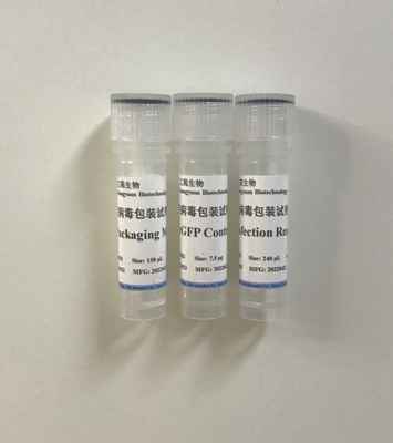 保存条件 冰袋运输。Transfection Reagent 4 ºC保存,长期不使用可-20ºC保存。其余组分均于-20℃保存, 避免反复冻融。保质期1年有效。 注意事项 1.废弃的含病毒的培养基中加入84消毒液(1:20左右),浸泡1天后丢弃。接触过病毒的枪头,离心管,培养板等其他物品可用84消毒液稀释液处理,也可以用煮沸处理半小时或常规灭菌(121℃,20 min)。 2.本产品仅用于科学研究。 3.为了您的安全和健康,请穿实验服并戴一次性手套操作。 还需准备的其他实验材料 1.表达目的基因的慢病毒载体质粒:在慢病毒包装前,需要先获得感兴趣的目的基因慢病毒载体,该载体可能表达目的基因、shRNA或microRNA等。以无内毒素高纯度的试剂盒提取表达目的基因的慢病毒载体质粒,并将质粒DNA溶于无菌的TE或ddH2O中,测定其浓度及纯度,保证质粒DNA的A260/A280在1.8-2.0之间。江苑生物提供基因过表达、shRNA/miRNA介导的基因沉默、CRISPR/Cas9介导的基因敲除等服务。 2.慢病毒包装用293T细胞株:良好的细胞状态对病毒的包装至关重要,避免细胞培养基有细菌、真菌或支原体的污染,尽量使用传代次数较少的细胞,如果细胞是刚复苏的话,更好传两代之后再包装。 3.细胞培养基,血清和双抗等 4.其他常用实验耗材(如10 cm培养皿,离心管等) 使用说明 以10 cm培养皿为例: 1.293T细胞分盘:转染前,将293T细胞以合适的比例传代到10 cm培养皿中,当细胞长到70%-90%时准备转染。 注:细胞要充分消化,成团细胞影响转染效率。 2.转染前换液:转染前将需要转染的细胞换成新鲜的完全培养基(含有血清和抗生素),10 mL/10 cm皿。注:293T细胞贴壁性不是很好,换液时应小心滴加尽量避免冲起细胞。抗生素和血清不会影响转染效率,也不会在细胞转染后导致细胞毒性。 3.转染:取无菌的离心管,加入750 μL DMEM(不含血清和抗生素),7.5 μg表达目的基因的慢病毒载体质粒(自行提供),和15 μL Packaging Mix,用枪轻轻吹打混匀;再加入25 μL Transfection Reagent,用枪轻轻吹打混匀,请特别注意不可Vortex或离心。将混合液均匀滴加到提前换液的培养皿中,轻轻混匀,置于培养箱中培养,后续无需在数小时后更换培养液。