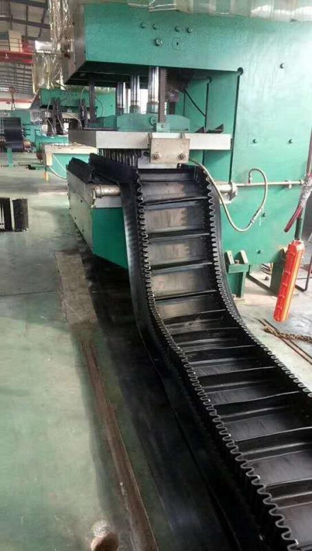 大倾角挡边提升带, 是由基带、挡边、横隔板3部分组成。挡边起防止物料测滑撒落的作用。为便于绕过滚筒,档边设计成波纹状;横隔板的作用是承托物料,为了实现大倾角输送,采用T型TC型。档边和横隔板是用二次硫化的方法与基带连接的,具有很高的连接强度。用于输送易散落的粉状、粒状、小块状、糊状及液态状物料。其特点:适用于倾角0°~90°散装物料的输送;具有使用范围广、占地面积小、无转运点、减少土建投资、维护费用低、维修容易输送量大连续化、高效率、大倾角运输,操作安全,使用简便,,运费低廉,并能缩短运输距离,降低工程造价,节省人力物力等特点;解决了普通带和花纹带所不能达到的输送角度;还可根据使用环境,设计成完整、独立的输送系统,避免了间断输送和复杂输送的提升系统。可沿水平、倾斜、垂直和变角方向输送各种散装物料,从煤、矿石、沙子到化肥和粮食等。物料粒度不限,可从很小的粒度到400mm的大粒度,输送量可从1立方米/小时到6000立方米/小时。 【大倾角挡边提升带 】产品特点 产品特点(普通型大倾角挡边带): 1、增大了输送角度(30~90度); 2、占地面积小,投资少; 3、输送量大、提升高度更高; 4、从水平到倾斜(或垂直)能平稳过渡; 5、适宜输送易撒落的粉状、粒状、小块状、糊状及液态状物料; 6、能耗低、结构简单、胶带强度高、使用寿命长。 |