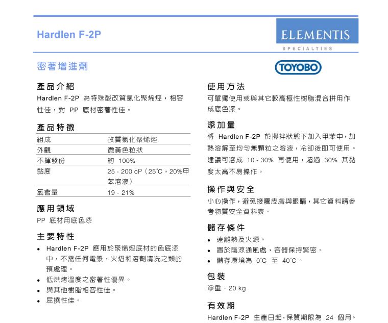F-2P是日本东洋纺公司生产的马来酸改性的氯化聚丙烯树脂,主要用于聚丙烯塑料的底涂和粘结,具有中等程度的氯含量,因而在大多数PP材料上面都有良好的附着力。