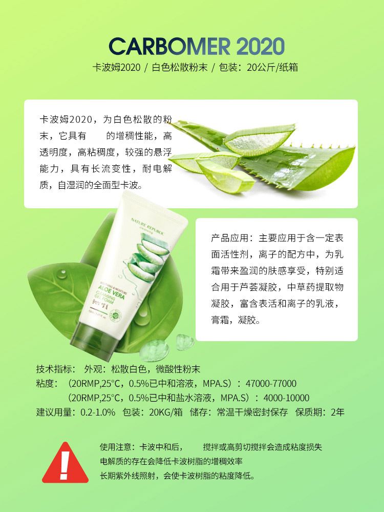 卡波姆2020 INCI名称:丙烯酸酯/C10-30烷基丙烯酸酯交联共聚物 Carbomer2020是一种交联的丙烯酸酯/C10-30烷基丙烯酸酯共聚物。聚合溶剂体系为乙酸乙酯和环己烷。它具有长流变性、耐离子性、高透明度,具有优良的增稠,悬浮性能,适用于表面活性剂体系和透明凝胶系。 Carbomer2020能快速润湿,缓慢溶胀,这一特性使得体系分散粘度低,容易分散,更容易输送。 特点和优点: